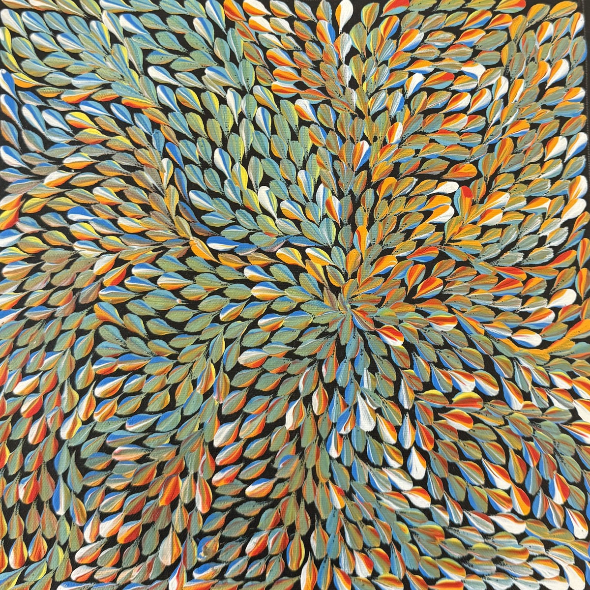 Violet paints the story of the wild tobacco or pituri (Nicotiana spp.). In Violet’s language it is called ngkwerlp. This herb has soft leaves and creamy white, trumpet shaped flowers with two-valved seed capsules. Occurring naturally in Central Australia, it is found plentiful in Violet’s home in the Utopia Region, northeast of Alice Springs. The leaf of the plant is picked and chewed by the aboriginal people and can also be used for medicinal purposes. In the olden days, and in some areas today, the seeds would be collected and replanted by the aboriginal people.