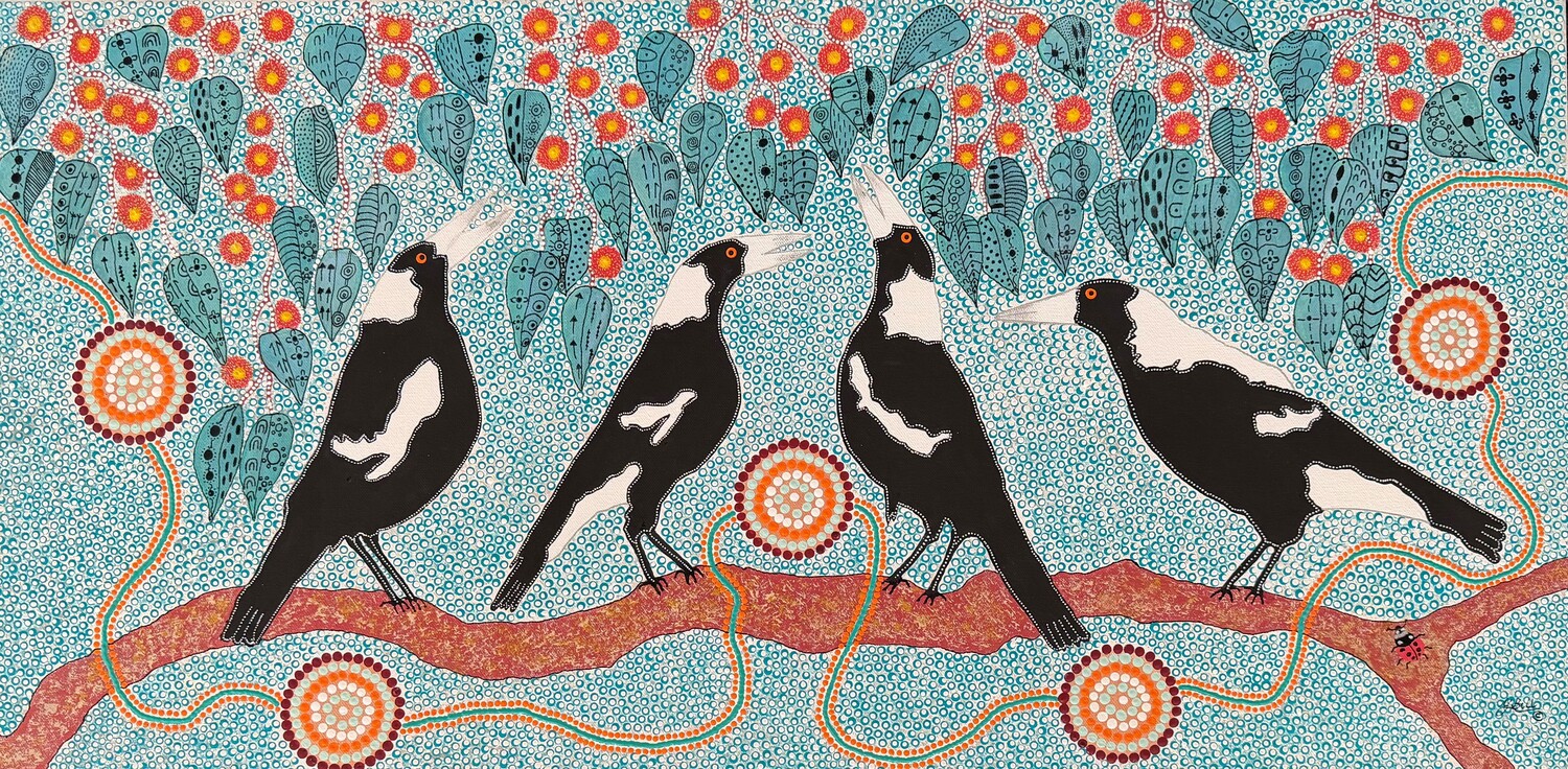 This artwork is a tribute to the beautiful Kulbardi (Magpie), a bird that has been a constant presence in her life. These alert and intelligent birds fill the bush with their distinctive warbling songs, especially in the early morning, reminding her of her deep connection to her home Country.